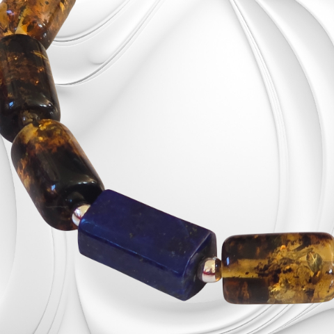 Oryginalna bransoleta z bursztynu i lapisu lazuli z dodatkiem srebrnego hematytu. Naturalna elegancja i komfort dzięki gumce silikonowej.
