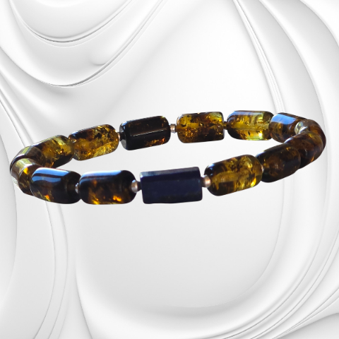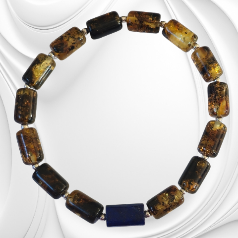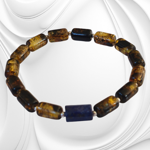 Bransoleta z bursztynu i lapisu lazuli z hematytem zachwyca naturalnym kontrastem i elegancją.