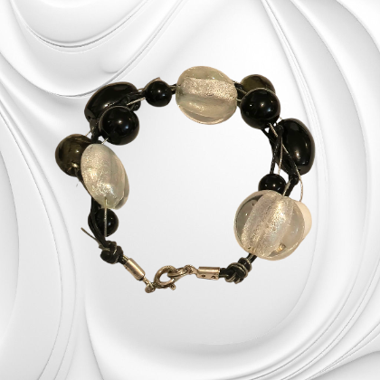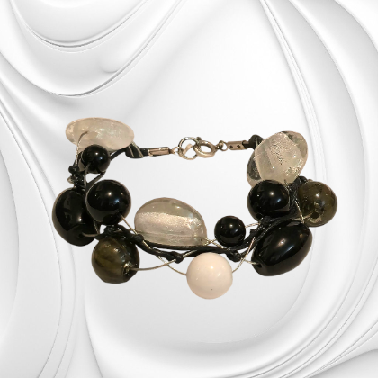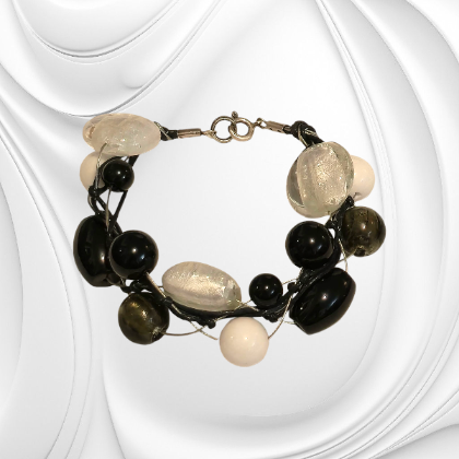 Elegancka bransoleta z kamieni półszlachetnych to doskonały wybór dla osób ceniących stylowe dodatki o wyjątkowym charakterze. Wykonana z naturalnego onyksu i ozdobiona artystycznym szkłem weneckim, zachwyca połączeniem klasycznej czerni z subtelnym połyskiem szkła.