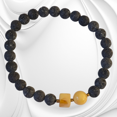 Ta bransoleta z lawy wulkanicznej i bursztynu to nie tylko ozdoba, ale również symbol energii, stabilności i spokoju ducha.