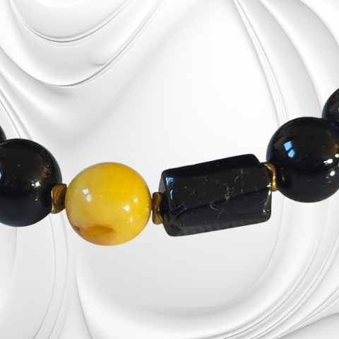 Bransoleta z bursztynu, onyksu i czarnego turmalinu to wyjątkowy dodatek dla osób, które cenią minimalizm, naturę i znaczenie kamieni. Ręcznie wykonana, elastyczna i trwała – idealnie komponuje się zarówno z codziennym strojem, jak i elegancką stylizacją.