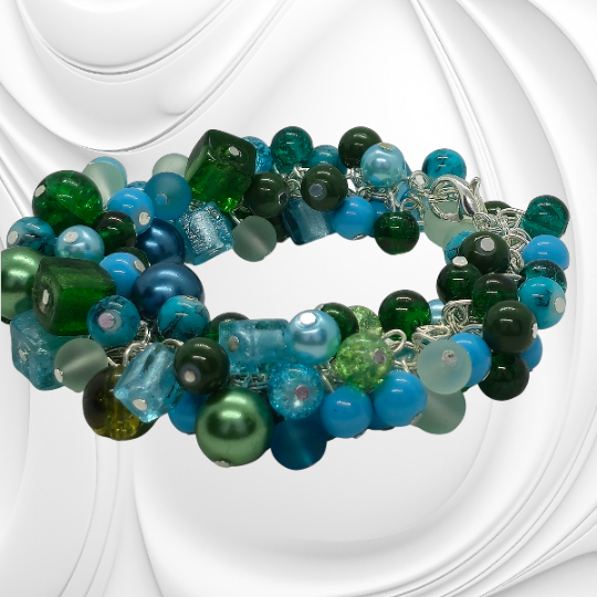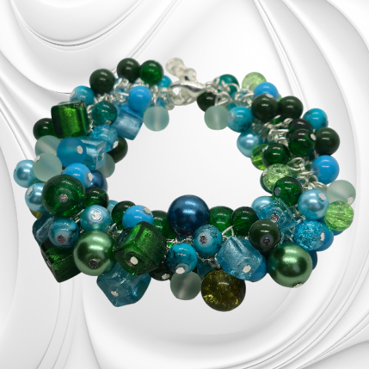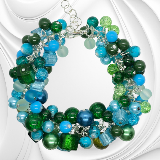 Bransoletka handmade w odcieniach błękitu, zieleni i turkusu zachwyca świeżymi kolorami inspirowanymi naturą. Połączenie szklanych koralików z elementami ze stali chirurgicznej tworzy elegancką i lekką biżuterię, która przyciąga uwagę subtelnym blaskiem i wyjątkową kolorystyką. Kolory błękitu, zieleni i turkusu przywołują skojarzenia z czystą wodą, spokojnym niebem i naturą. Dzięki temu bransoletka posiada świeży i harmonijny charakter.