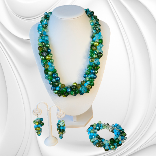 Ręcznie wykonywana biżuteria posiada szczególną wartość – każdy egzemplarz jest tworzony z dbałością o detale i indywidualny charakter. Bransoletka handmade w odcieniach błękitu, zieleni i turkusu może być pięknym prezentem dla osoby, która ceni unikalną biżuterię oraz rękodzieło. Do kompletu polecamy również kolczyki oraz naszyjnik wykonane w podobnym tonie, które razem z bransoletką tworzą harmonijny zestaw biżuterii.