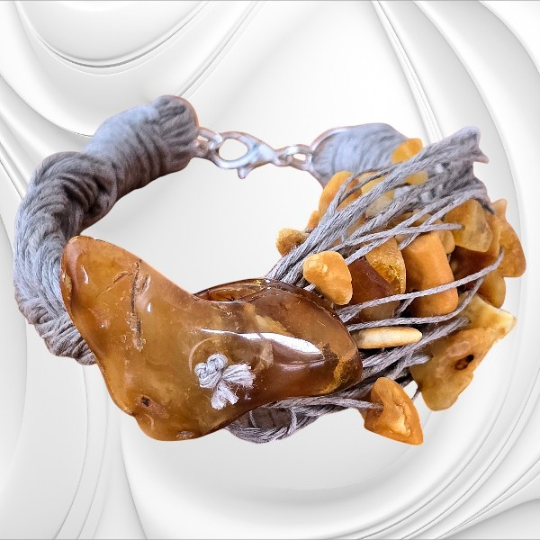 Bursztyn bałtycki powstał miliony lat temu z żywicy pradawnych drzew. Jego ciepła barwa oraz unikalne wzory sprawiają, że od wieków jest cenionym materiałem wykorzystywanym w biżuterii. W tej bransoletce wykorzystano naturalne bryłki bursztynu, które zachowały swój nieregularny kształt. Każdy fragment kamienia różni się odcieniem, przejrzystością oraz strukturą, dzięki czemu każda bransoletka z bursztynem bałtyckim jest jedyna w swoim rodzaju.