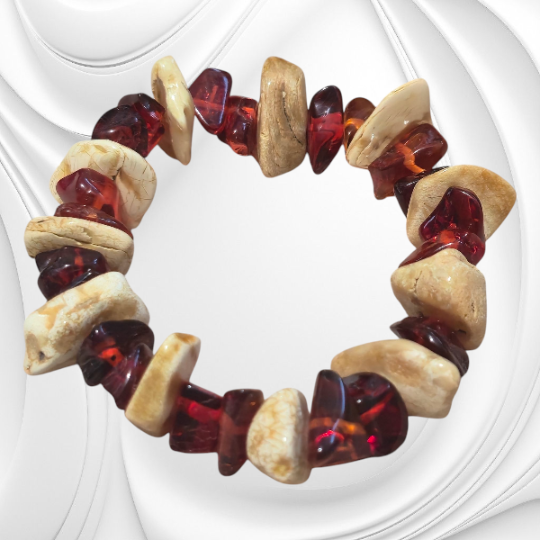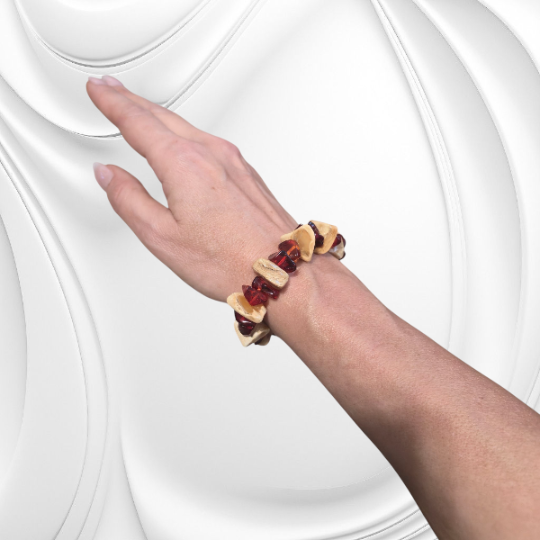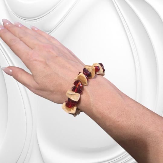 Odkryj bransoletkę z bursztynu mleczno-karmelowego i czerwonego lakierowanego. Naturalna elegancja na gumce jubilerskiej – idealna na prezent.