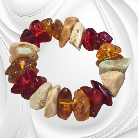 Zamknęliśmy w tej bransoletce ciepło bałtyckiego słońca i energię natury. Każda bryłka bursztynu powstała miliony lat temu, zachowując w sobie wspomnienie pradawnych drzew i żywicy. Połączenie jasnego mleczno-karmelowego bursztynu z koniakowym przywołuje spokój i ciepło letniego dnia, a czerwony akcent przypomina o sile i pasji ukrytej w każdej kobiecie. Ta bransoletka to nie tylko ozdoba – to historia zapisana w kamieniu, który przetrwał czas, by dziś zdobić Twój nadgarstek.