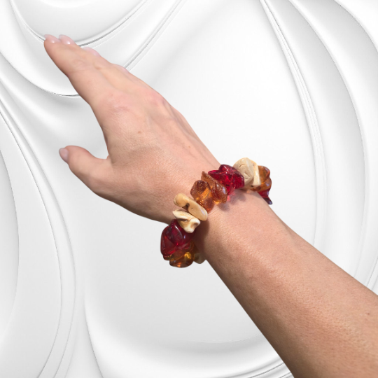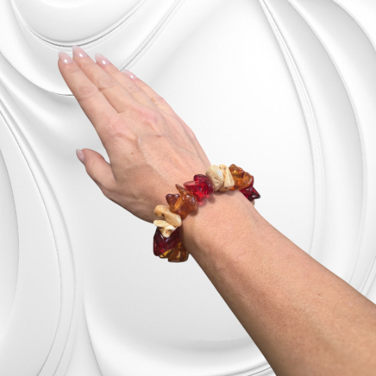 Bransoletka z bursztynu mleczno-karmelowego i koniakowego z czerwonym akcentem to połączenie natury, pasji i elegancji.