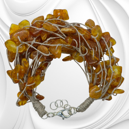 Bursztyn bałtycki od wieków uznawany jest za kamień słońca i energii. Noszony jako ozdoba symbolizował ochronę, spokój i harmonię. Ta bransoletka przywołuje klimat nadmorskich spacerów i szumu fal, jakby każdy kamień zachował w sobie fragment światła zatrzymanego przed milionami lat.
