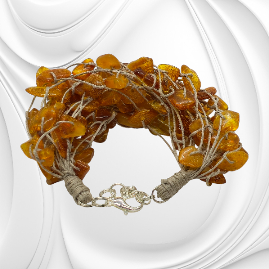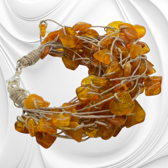 Bransoletka z bursztynu bałtyckiego na lnianym sznurku zachwyca naturalnym blaskiem i lekkością. Ta bransoletka z bursztynu bałtyckiego została wykonana z drobnych, polerowanych bryłek naturalnego kamienia, które zachwycają ciepłą barwą i organiczną strukturą. Każdy fragment bursztynu jest niepowtarzalny, dzięki czemu biżuteria ma indywidualny charakter i podkreśla autentyczność naturalnego materiału. Lniany sznurek nadaje kompozycji lekkości i naturalnego stylu, tworząc harmonijne połączenie z ciepłym odcieniem bursztynu.