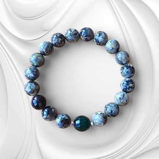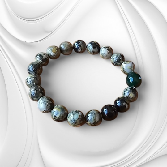 Subtelne przekładki z hematytu wprowadzają kontrast i rytm, podkreślając kolor zielonego bursztynu oraz agatu. Dzięki nim bransoletka zyskuje nowoczesny akcent, zachowując jednocześnie naturalną harmonię i elegancję, idealną do codziennego noszenia.