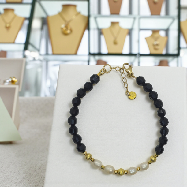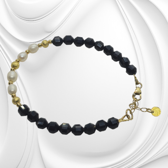 Ta bransoletka wykonana z naturalnych pereł, czarnego onyksu i srebra łączy w sobie klasykę i nowoczesny design. Każda bransoletka powstaje ręcznie, z dbałością o najdrobniejsze szczegóły, dzięki czemu każda sztuka jest unikatowa.