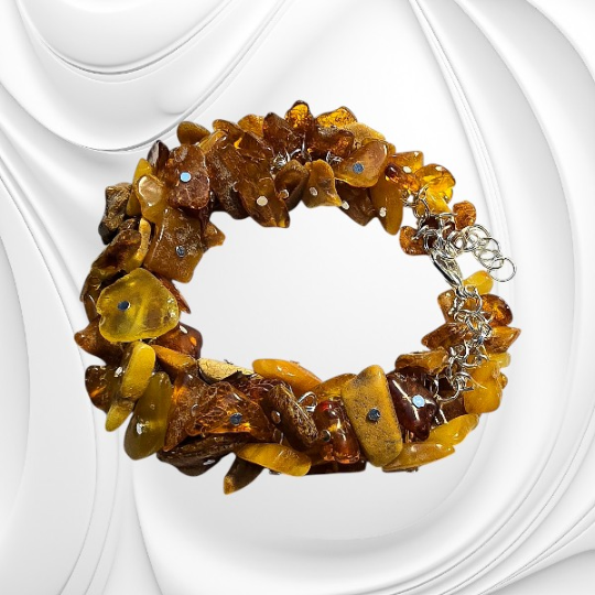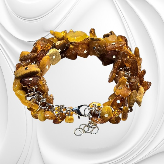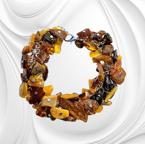 Bransoletka z nieregularnych polerowanych bryłek naturalnego bursztynu bałtyckiego w odcieniach od mlecznego po koniak zachwyca naturalną formą i ciepłym blaskiem. To wyjątkowa biżuteria z bursztynu, która łączy autentyczność natury z nowoczesną trwałością stali chirurgicznej. Bursztyn bałtycki od wieków ceniony jest za swoją różnorodność i unikalne właściwości wizualne. W tej bransoletce wykorzystano polerowane, nieregularne bryłki bursztynu, których odcienie przechodzą od delikatnego mlecznego po ciepły koniak.