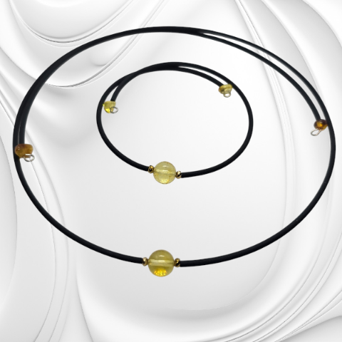 Choker z bursztynem na drucie pamięciowym powleczonym kauczukiem. Naturalna elegancja i nowoczesna forma. Do kompletu polecamy bransoletkę.