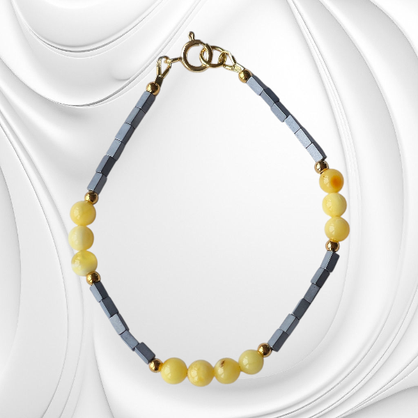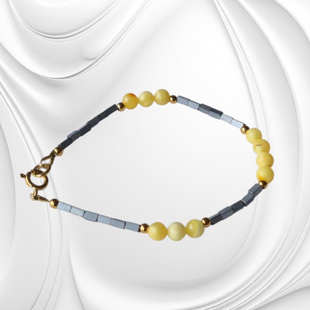 Elegancka bransoletka z hematytu i mlecznego bursztynu to połączenie klasy, subtelności i naturalnego piękna. Wykonana ręcznie z wysokiej jakości kamieni naturalnych, ozdobiona złoconym srebrnym zapięciem, zachwyca blaskiem i delikatnym kontrastem barw. Idealna dla kobiet, które cenią elegancję i wyjątkowy styl.