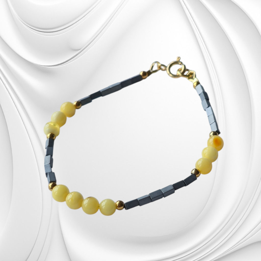 Elegancka bransoletka z mlecznego bursztynu i hematytu ze złoconym srebrnym zapięciem. Ręcznie wykonana biżuteria – do kompletu naszyjnik w podobnym tonie.
