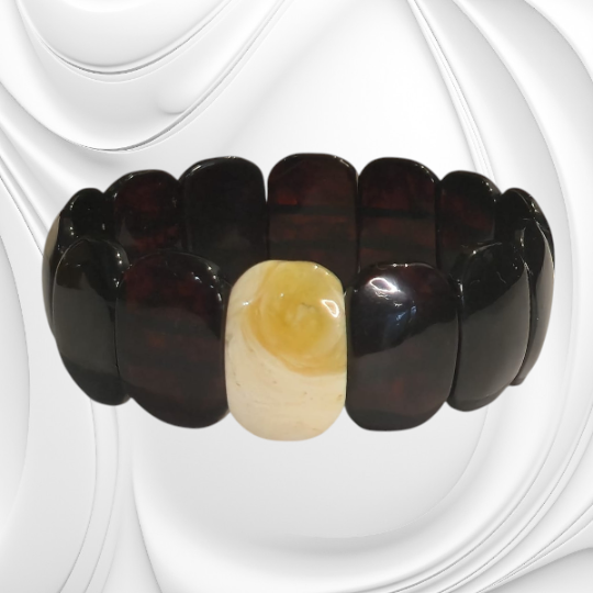 Ta elegancka bransoletka łączy głębię wiśniowego bursztynu z subtelnym akcentem mlecznej płytki, tworząc unikatowy dodatek.