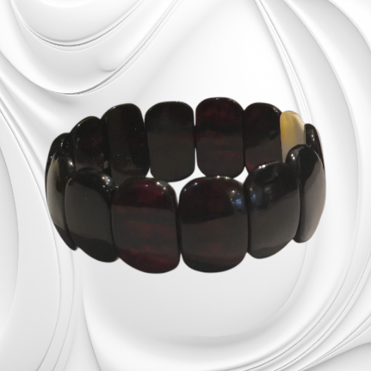 Bransoletka została wykonana z naturalnych płytek wiśniowego bursztynu bałtyckiego, z delikatnym akcentem jednej płytki mlecznego bursztynu, który podkreśla unikatowość projektu. Każda płytka została starannie dobrana pod względem kształtu i koloru, a ich lekko polerny połysk dodaje elegancji i subtelnego blasku. Gumka jubilerska sprawia, że bransoletka dopasowuje się do nadgarstka i jest bardzo wygodna w codziennym noszeniu. Ręczne wykonanie gwarantuje, że każda bransoletka jest wyjątkowa, a połączenie głębokiego wiśniowego koloru z delikatnym mlecznym akcentem przyciąga wzrok i podkreśla indywidualny styl.