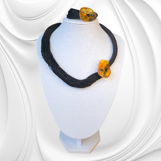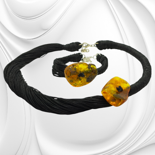 Elegancki komplet lnianej biżuterii z bryłkami naturalnego bursztynu – naszyjnik i bransoletka. Ręcznie wykonane, ze zapięciem ze stali chirurgicznej. Naturalny styl, idealny na prezent.