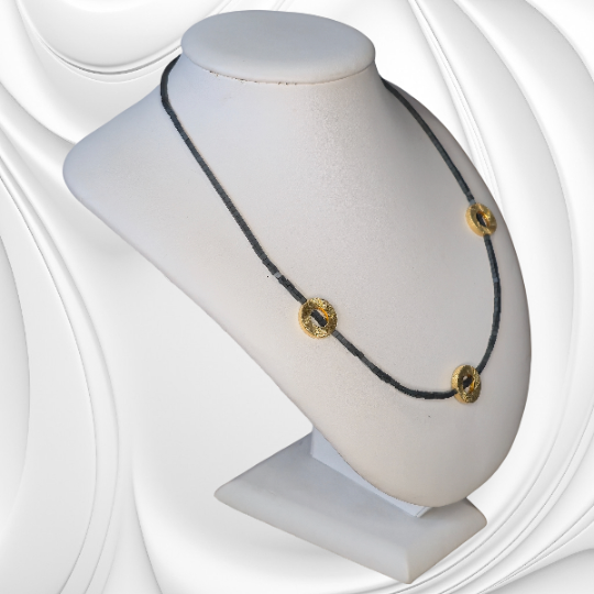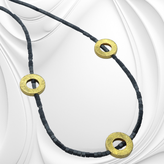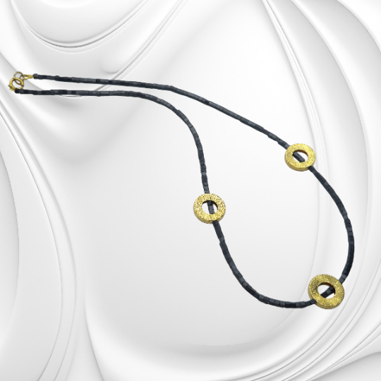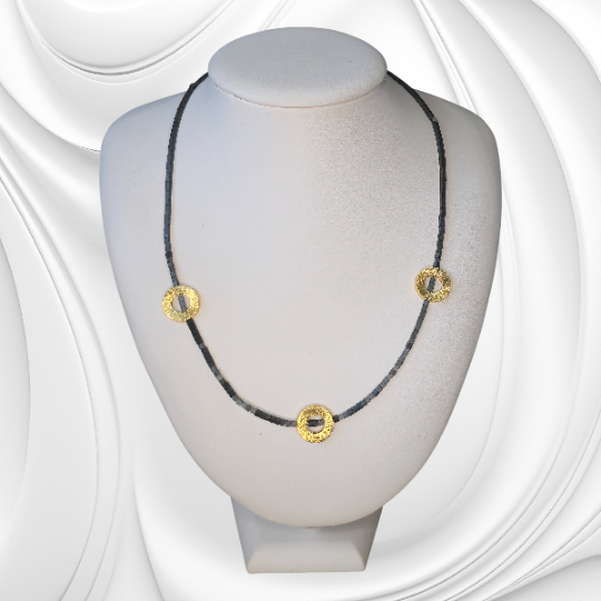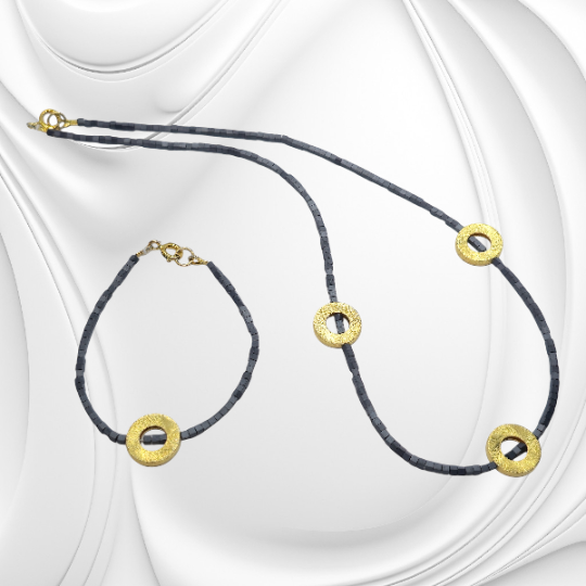 Elegancki naszyjnik z hematytu ze złoconymi elementami ozdobnymi to połączenie klasy i nowoczesnego stylu. Ten naszyjnik z hematytu ze szczotkowanymi złoconymi elementami to wyjątkowa propozycja dla kobiet ceniących prostotę, elegancję i ręczne wykonanie. Został stworzony z naturalnych kamieni hematytu, które przyciągają uwagę swoim metalicznym połyskiem i głęboką barwą. Centralną ozdobą naszyjnika są szczotkowane koła wykonane ze złoconego srebra, symbolizujące doskonałość, jedność i równowagę.