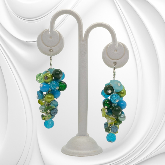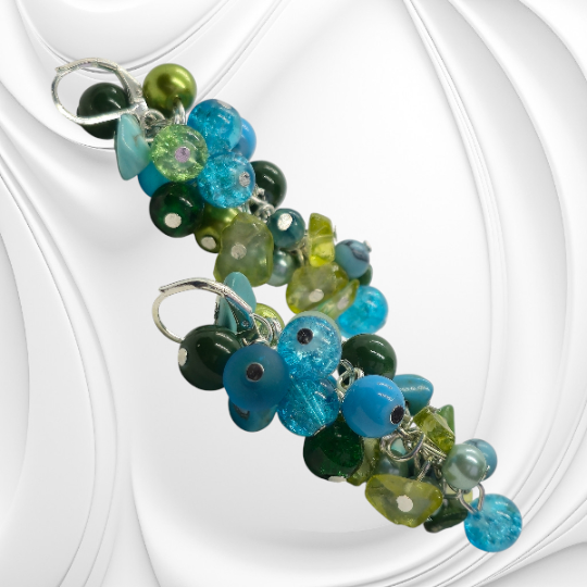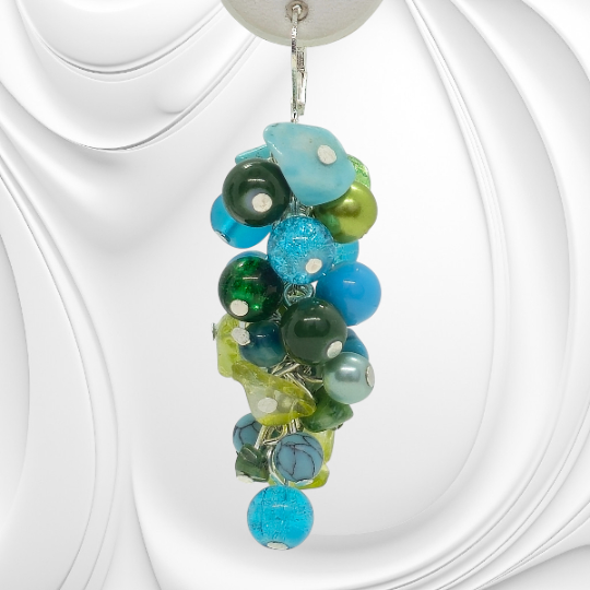 Kolczyki handmade w odcieniach błękitu, zieleni i turkusu przyciągają uwagę harmonijną kolorystyką inspirowaną naturą. Połączenie szklanych koralików z eleganckim srebrnym zapięciem tworzy lekką i stylową biżuterię, która subtelnie podkreśla kobiecy styl. Kolory błękitu, turkusu i zieleni przywołują skojarzenia z czystym niebem, spokojną wodą oraz świeżością natury. Dzięki temu kolczyki posiadają lekki i harmonijny charakter.