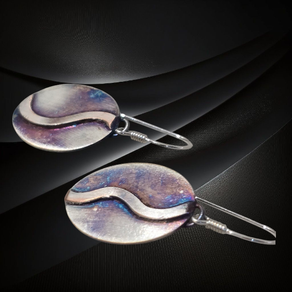 Kolczyki srebrne z dodatkiem brązu – owalne, ręcznie robione, unikatowe – bigle. Biżuteria artystyczna handmade.
