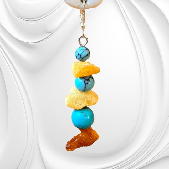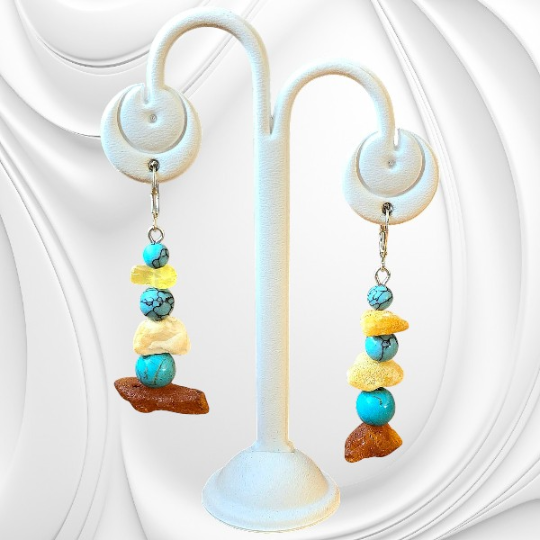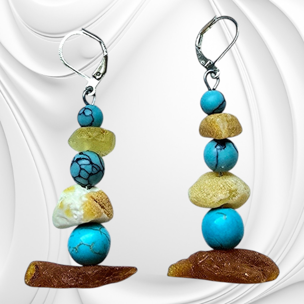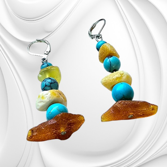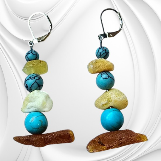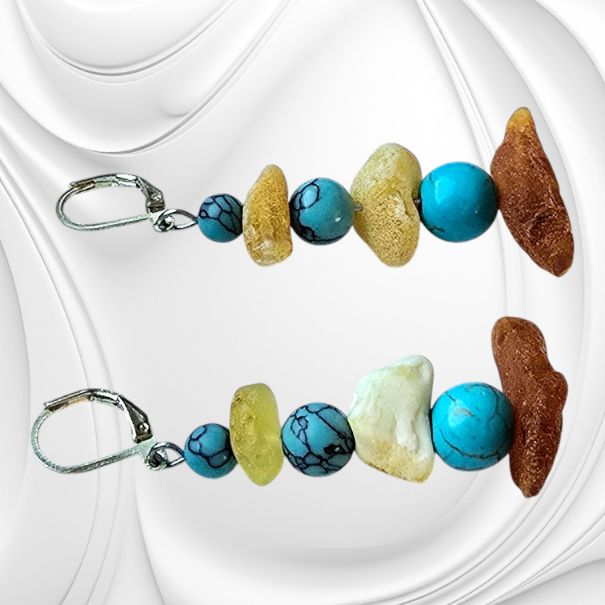 Kolczyki z nieregularnych bryłek naturalnego bursztynu bałtyckiego i turkmenitu. Oryginalna biżuteria z kamieni naturalnych ze srebrnym zapięciem.