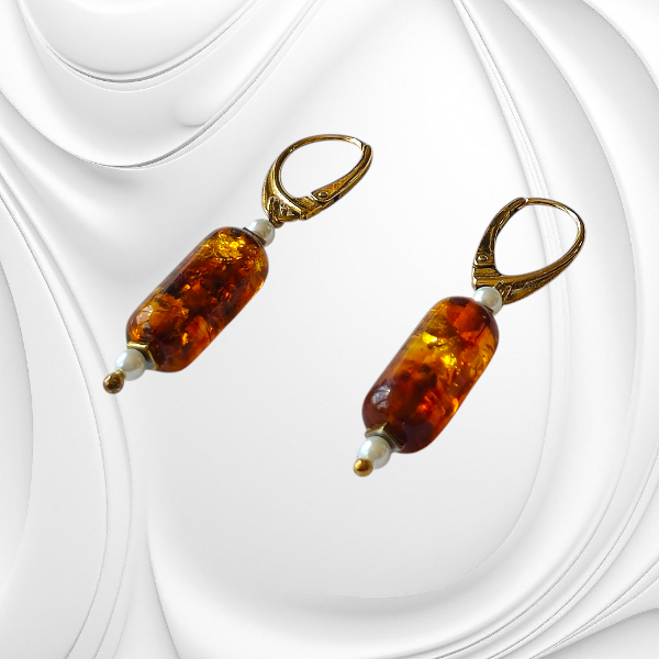 Kolczyki z bursztynu, białych pereł i złotego hematytu – złocone srebro, ręcznie wykonane.