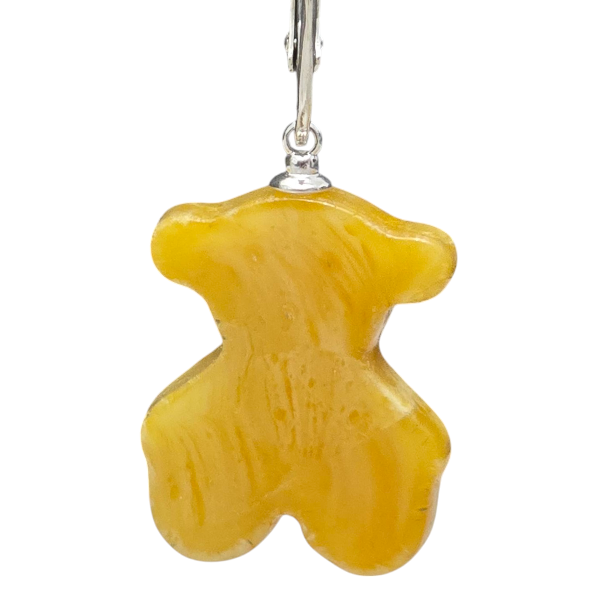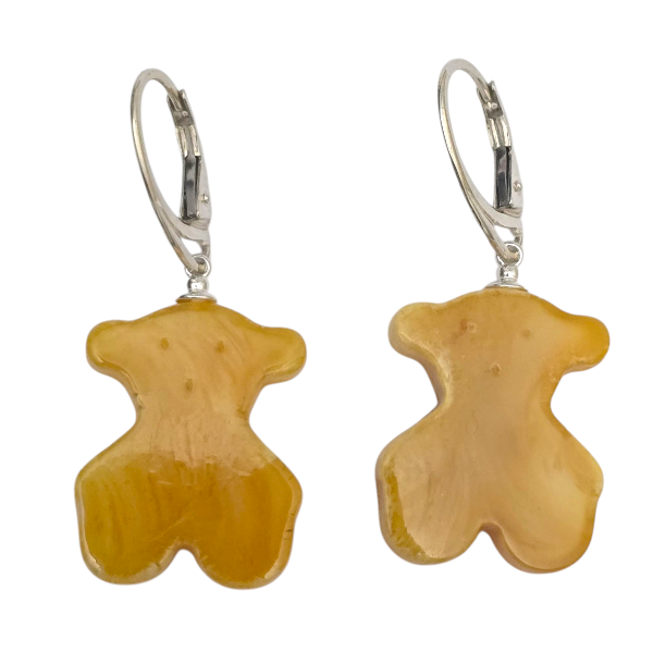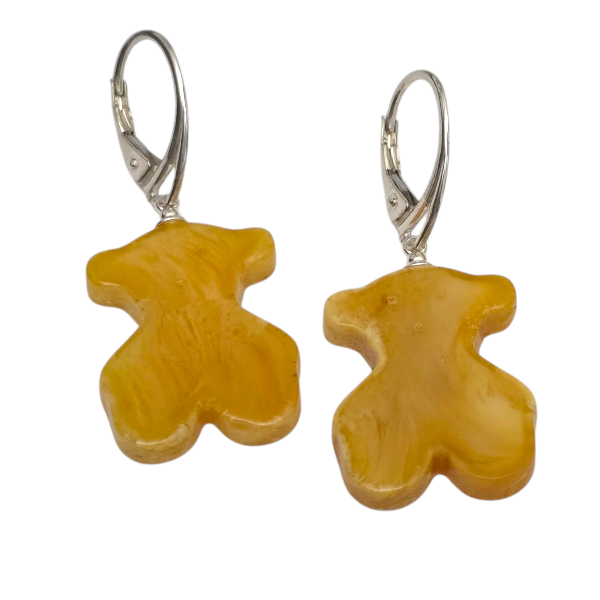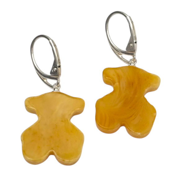 Kolczyki z bursztynu w kształcie misia to ręcznie wykonana biżuteria z miodowym bursztynem i srebrem.