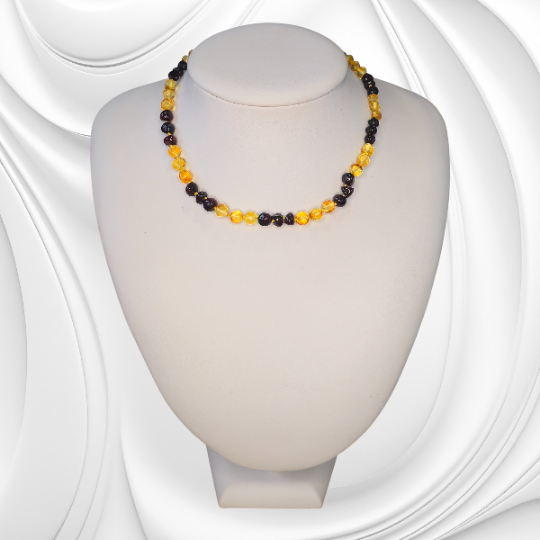 Kolorowy naszyjnik z drobnych kulek bursztynu w odcieniach słońca i ciemnego koniaku zachwyca lekkością. Ten kolorowy naszyjnik z bursztynu łączy w sobie dwa najbardziej cenione odcienie naturalnego bursztynu: ciepły słoneczny oraz głęboki ciemny koniak. Subtelne, drobne kulki zostały starannie dobrane, aby stworzyć naturalną, pełną harmonii kompozycję, która idealnie podkreśla dekolt i dodaje blasku każdej stylizacji. Dzięki swojej kolorystyce biżuteria pięknie prezentuje się zarówno w świetle dziennym, jak i wieczornym, wydobywając naturalną głębię bursztynu.