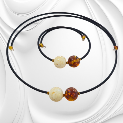 Jeśli szukasz biżuterii, która łączy ponadczasowy bałtycki bursztyn z nowoczesną formą – ten choker i bransoletka z bursztynowych kulek na drucie pamięciowym będzie idealnym wyborem. Elastyczna forma kompletu doskonale dopasowuje się do kształtu szyi i ręki, a czarny kauczuk nadaje całości surowego, minimalistycznego charakteru.