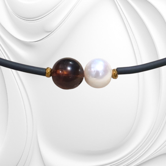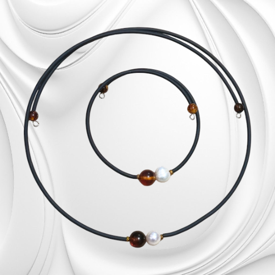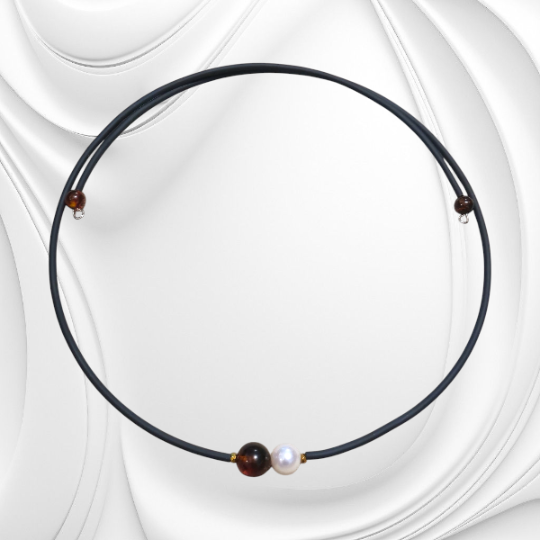 Ten naszyjnik choker z perłą i bursztynem to wyjątkowa propozycja dla osób ceniących subtelne piękno i oryginalny styl. Został wykonany z naturalnej perły oraz kulki bursztynu bałtyckiego, osadzonych na drucie pamięciowym pokrytym kauczukiem, który delikatnie dopasowuje się do szyi i zachowuje swój kształt.