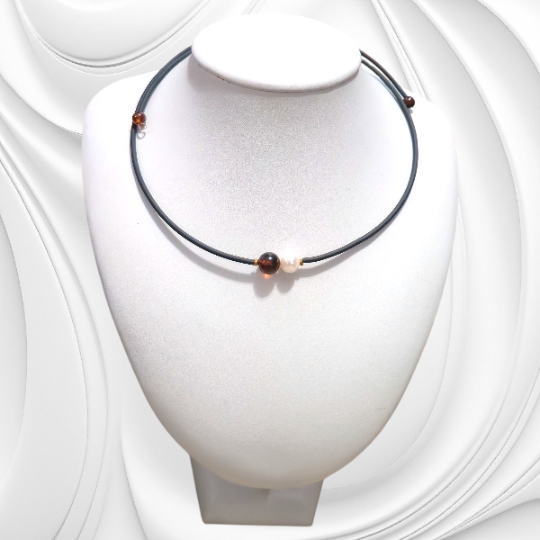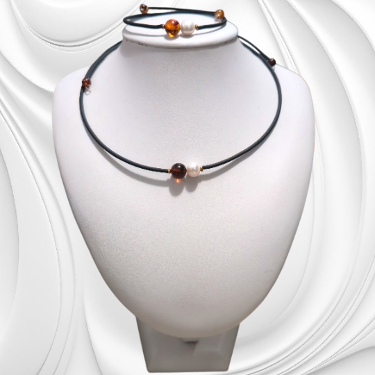 Naszyjnik typu choker z naturalną perłą i bursztynem to połączenie klasyki i nowoczesnej elegancji.