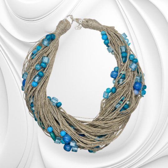 Ten wyjątkowy naszyjnik to połączenie naturalnych materiałów i artystycznego rzemiosła. Wykonany z plecionego lnianego sznurka ozdobionego drewnianymi oraz szklanymi koralikami, zachwyca subtelnością i organicznym charakterem.