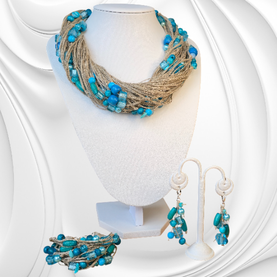 Naszyjnik w kolorze turkusu z lnu szkła i koralików