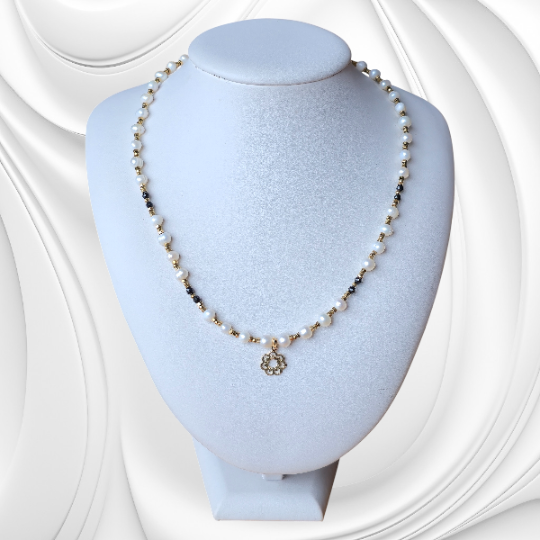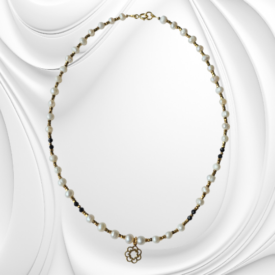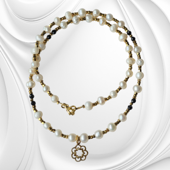 Elegancki naszyjnik z naturalnych białych pereł i onyksu z hematytowymi przekładkami. Wykończony pozłacanym srebrem. Ręcznie wykonana biżuteria klasy premium – idealna do eleganckich stylizacji i na wyjątkowe okazje.