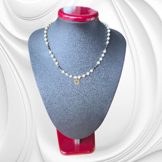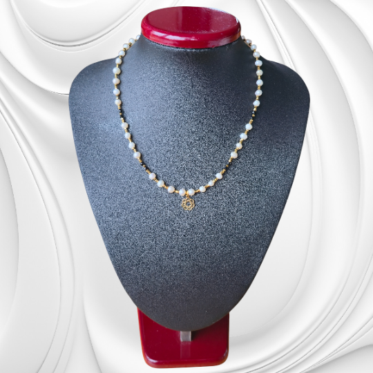 Ekskluzywny naszyjnik z białych pereł i onyksu, wykończony pozłacanym srebrem i hematytem – ręczne wykonanie. Naturalne białe perły urzekają ponadczasowym blaskiem i subtelnością, podczas gdy głęboka czerń onyksu nadaje kompozycji wyrazistego, eleganckiego charakteru. Drobne przekładki z hematytu dodają szyku i podkreślają precyzję ręcznego wykonania.