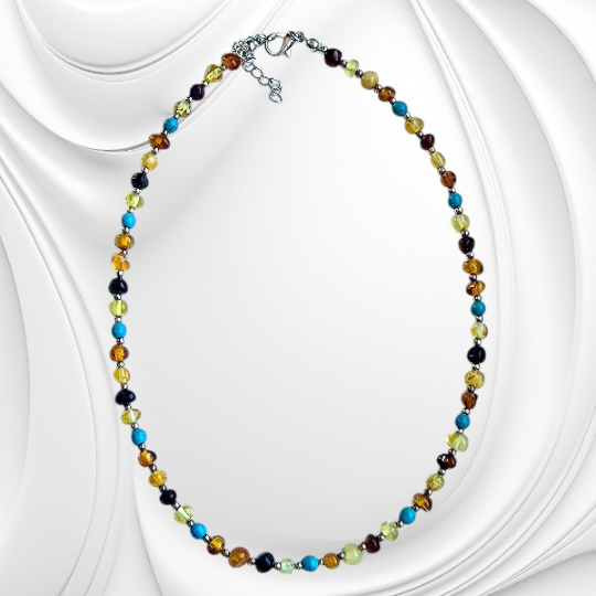 Naszyjnik z drobnych polerowanych kulek bałtyckiego bursztynu i turkusu to wyjątkowa biżuteria inspirowana naturą. Ciepłe odcienie bursztynu pięknie kontrastują z charakterystycznym niebiesko-zielonym kolorem turkusu, tworząc elegancką i harmonijną kompozycję. Polerowana powierzchnia kamieni subtelnie odbija światło, dzięki czemu naszyjnik prezentuje się niezwykle stylowo i przyciąga uwagę naturalnym blaskiem.