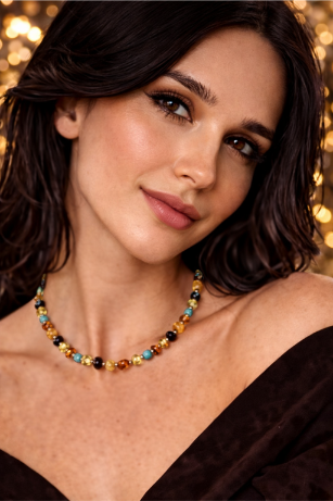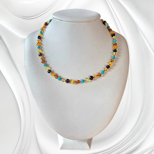 Turkus jest jednym z najbardziej charakterystycznych kamieni naturalnych. Jego intensywna barwa od wieków kojarzona jest z wodą, niebem i harmonią natury. Połączenie turkusu i bursztynu tworzy niezwykle interesującą kompozycję kolorystyczną. Kontrast między ciepłym bursztynem a chłodnym odcieniem turkusu sprawia, że naszyjnik wygląda elegancko i nowocześnie.
