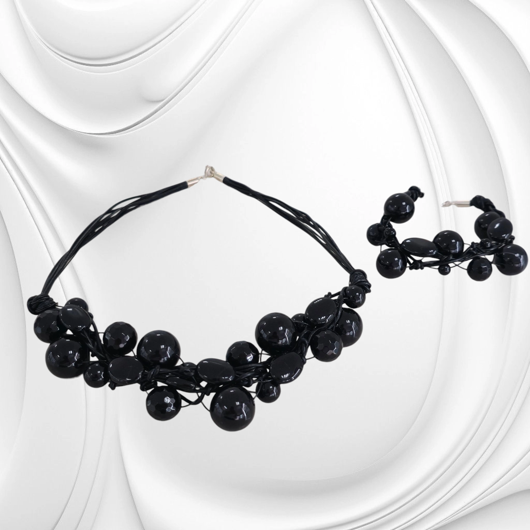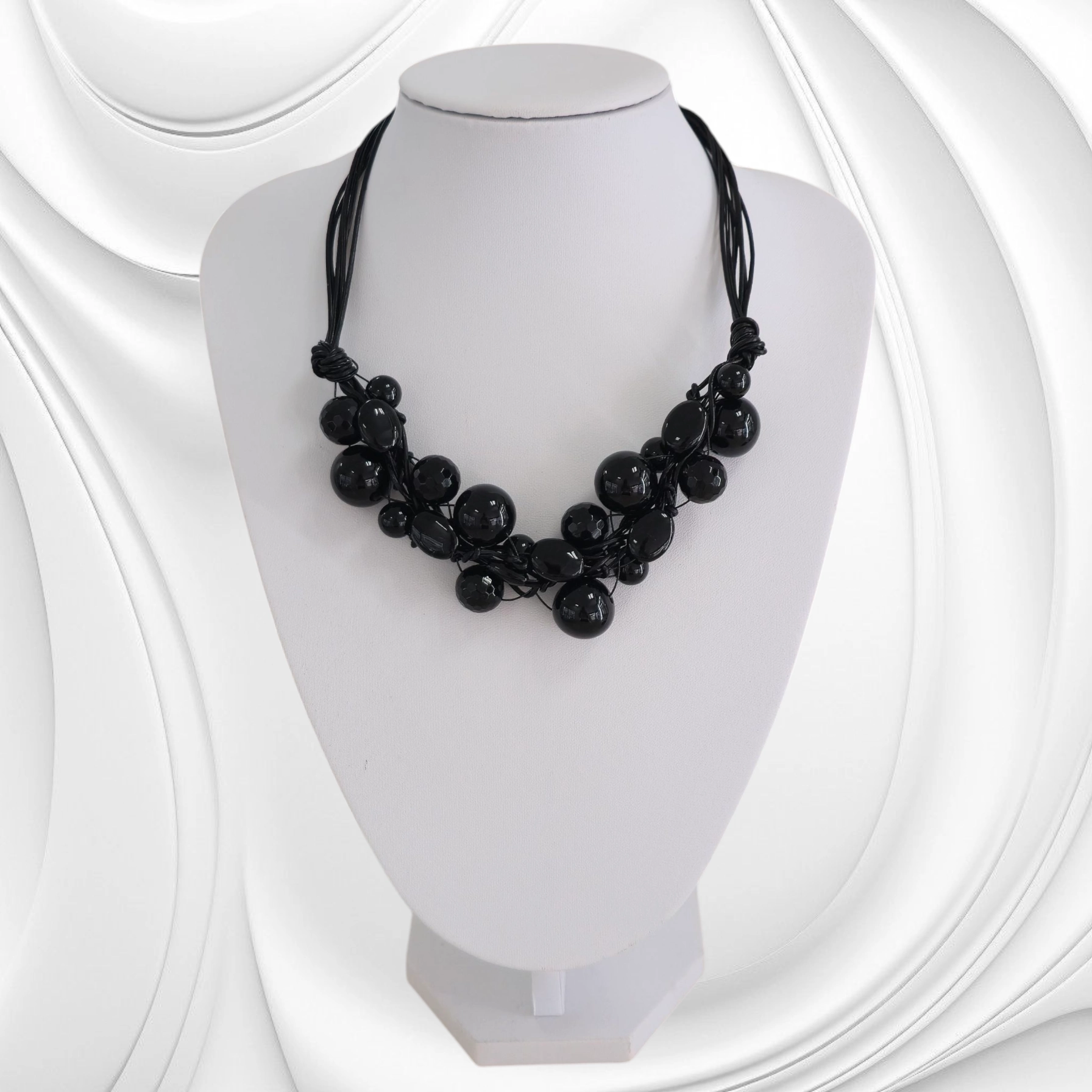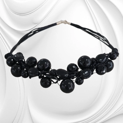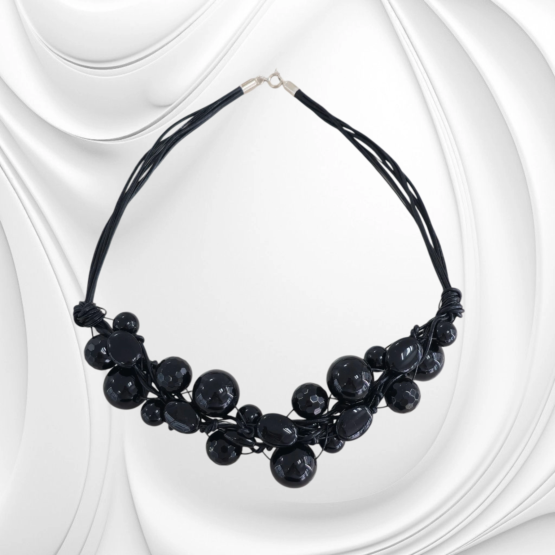 Ten ręcznie robiony naszyjnik to elegancka kompozycja czarnych kulek onyksu, osadzonych na precyzyjnie plecionym sznurku jubilerskim z dodatkiem drutu dla trwałości i elastyczności. Całość wieńczy klasyczne zapięcie ze srebra próby 925, które subtelnie dopełnia całą formę.