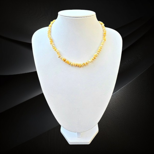 Naszyjnik z drobnych bryłek naturalnego polerowanego bursztynu bałtyckiego zachwyca lekkością i subtelnym blaskiem. Delikatne elementy bursztynu tworzą harmonijną kompozycję, która pięknie układa się na szyi i podkreśla naturalną elegancję. Bursztyn bałtycki od wieków fascynuje swoją historią i ciepłą kolorystyką. W tym naszyjniku wykorzystano drobne bryłki bursztynu, które zostały starannie wypolerowane, aby wydobyć ich naturalne piękno.