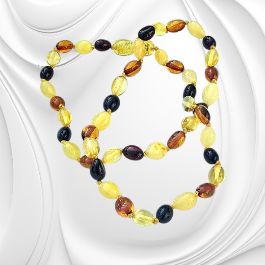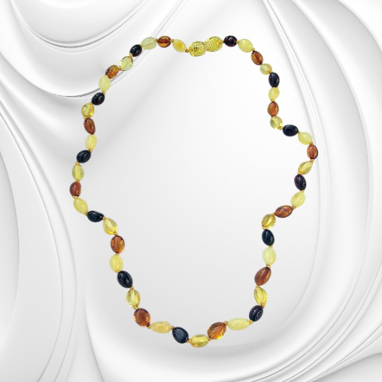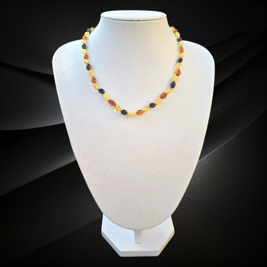 Naszyjnik łezek naturalnego polerowanego bursztynu bałtyckiego w odcieniach od mlecznego po ciemny koniak zachwyca elegancją oraz naturalną różnorodnością form i kolorów. Połączenie delikatnych kulek i subtelnych łezek bursztynu tworzy wyjątkową kompozycję, która przyciąga wzrok i podkreśla styl. Bursztyn bałtycki od wieków fascynuje swoją barwą i strukturą. W tym naszyjniku zestawiono dwa kształty – klasyczne kulki oraz eleganckie łezki – które razem tworzą harmonijną i dynamiczną formę. Kolorystyka obejmuje szeroką gamę odcieni – od jasnego mlecznego bursztynu po głęboki, ciemny koniak. Polerowana powierzchnia nadaje kamieniom subtelnego połysku, który pięknie odbija światło.