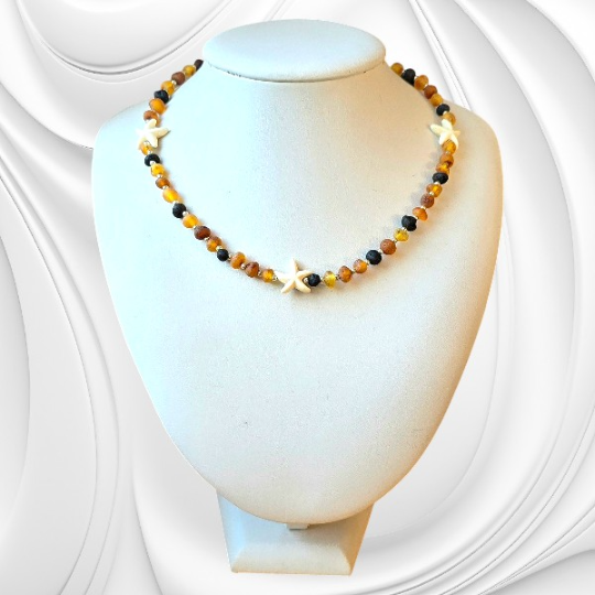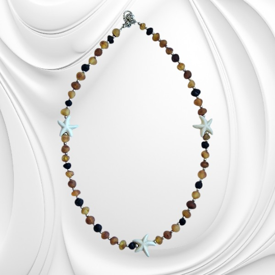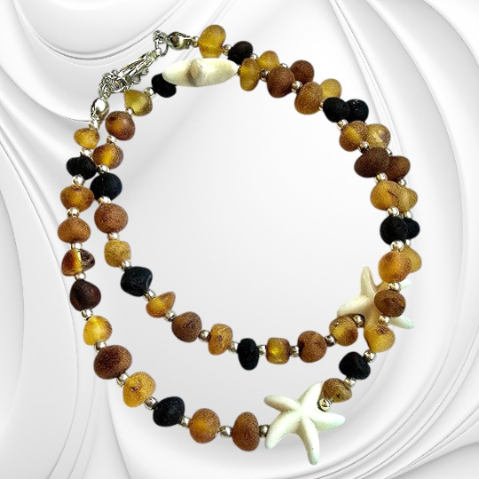 Bursztyn nazywany jest „złotem Bałtyku”, ponieważ od wieków zachwyca ludzi swoją barwą i niezwykłą historią powstania. Przez tysiące lat fale morza wyrzucały jego bryłki na brzeg, gdzie stawały się naturalnymi skarbami. Naszyjnik z kolorowych bryłek bursztynu przypomina właśnie takie nadmorskie znaleziska – surowe, piękne i pełne historii natury.