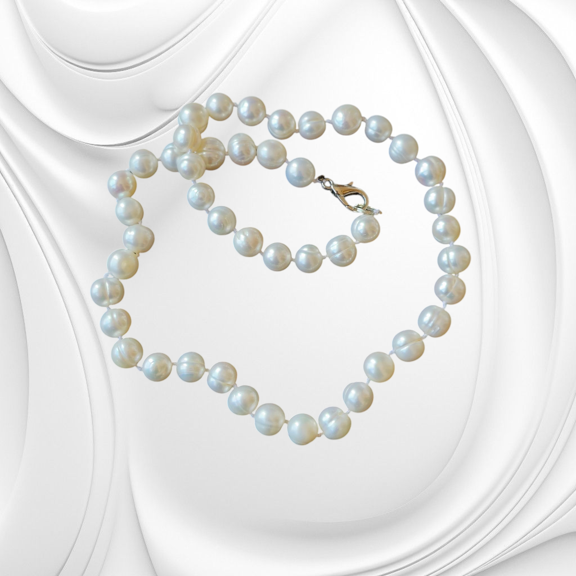 Elegancki i subtelny naszyjnik z naturalnych pereł rzecznych hodowlanych w klasycznym, perłowobiałym kolorze. Ręcznie wykonany z nieregularnych, unikatowych pereł o organicznej kulistej formie, które pięknie odbijają światło i podkreślają naturalne piękno biżuterii. Każda perła ma delikatne różnice w kształcie i połysku, co sprawia, że każdy egzemplarz naszyjnika jest jedyny w swoim rodzaju.