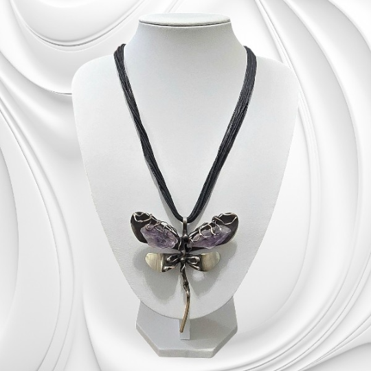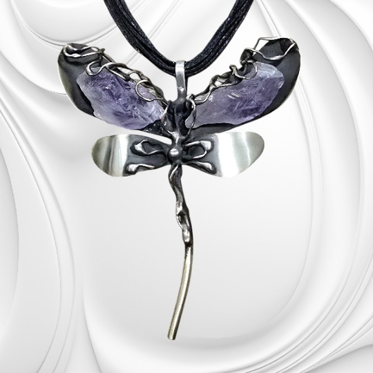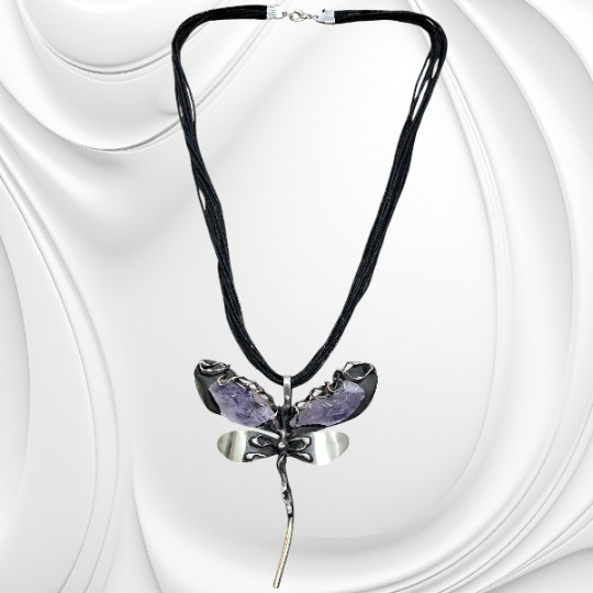 Naszyjnik z zawieszką w kształcie ważki ze stali chirurgicznej ozdobionej bryłkami ametystu. Delikatna biżuteria na sznurku o wyjątkowym charakterze.