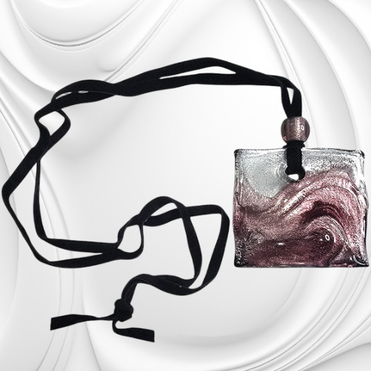 Naszyjnik został wykonany z zawieszki ze szkła Murano o unikatowej kompozycji kolorystycznej. Gładka, wypolerowana powierzchnia pięknie odbija światło, nadając biżuterii lekkości i elegancji. Zawieszka umieszczona jest na miękkiej aksamitce, która zapewnia komfort noszenia oraz podkreśla kontrast faktur. To idealna propozycja dla kobiet ceniących artystyczne dodatki i niepowtarzalne wzornictwo.