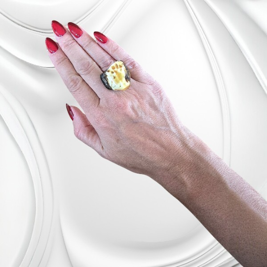 Pierścionek z dużym oczkiem z naturalnego bursztynu bałtyckiego w mleczno koniakowym odcieniu to wyjątkowa biżuteria inspirowana naturą. Subtelne połączenie kremowej, mlecznej barwy z ciepłymi tonami koniaku tworzy niezwykle harmonijną kompozycję kolorystyczną. Bursztyn osadzony w srebrnej oprawie przyciąga wzrok swoją naturalną strukturą, a regulowana obrączka zapewnia wygodę noszenia i idealne dopasowanie.