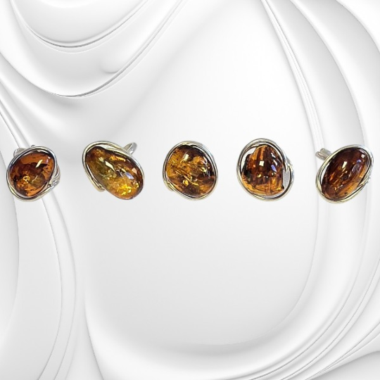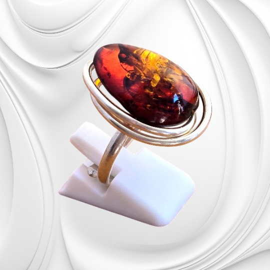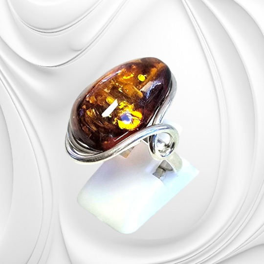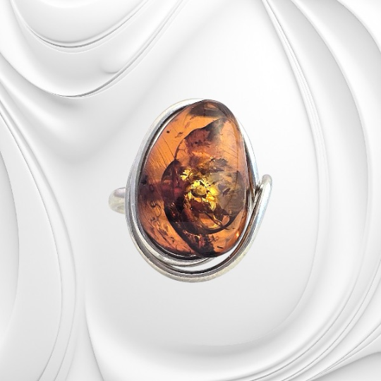 Pierścionek został wykonany z metalu pokrytego warstwą srebra, która nadaje mu elegancki wygląd i subtelny połysk. Centralnym elementem jest naturalny bursztyn bałtycki o ciepłym odcieniu i unikatowej strukturze. Regulowana konstrukcja umożliwia wygodne dopasowanie pierścionka do różnych rozmiarów palca, dzięki czemu biżuteria jest zarówno stylowa, jak i funkcjonalna.