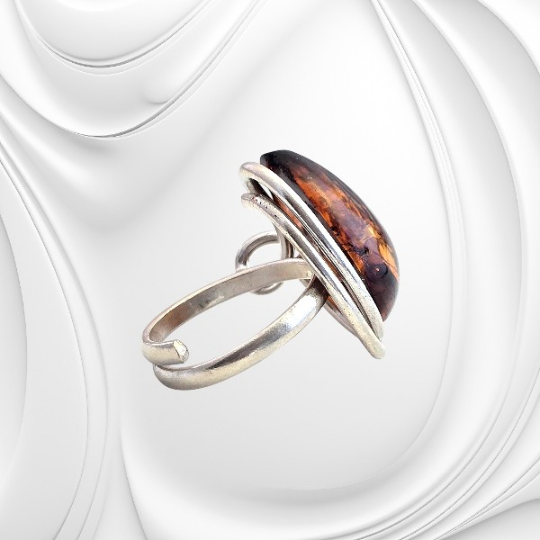Posrebrzany regulowany pierścionek z oczkiem z bursztynu bałtyckiego. Naturalny kamień, elegancki design i wygodne dopasowanie do każdego palca.