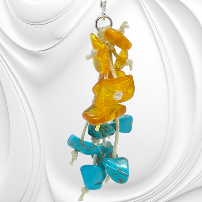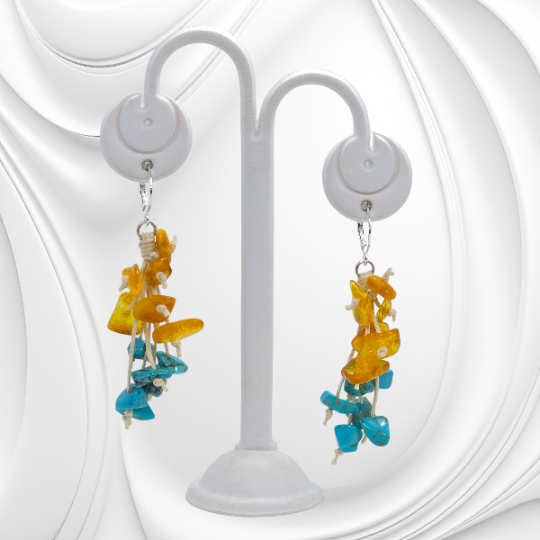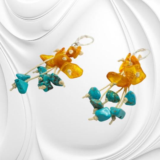 Te wyjątkowe kolczyki łączą w sobie naturalny bursztyn i turkmenit, nawleczone na delikatny lniany sznurek, co nadaje im lekkości i organicznego charakteru. Zapięcie wykonano ze srebra, zapewniając komfort noszenia i trwałość.