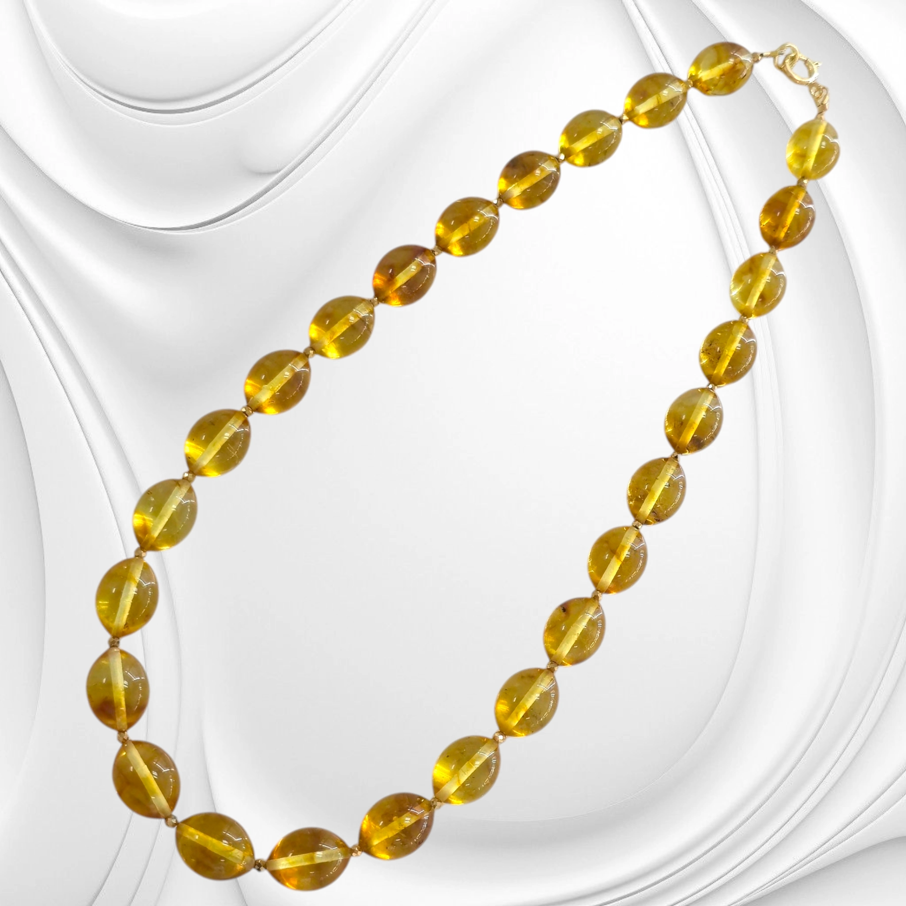Ten ręcznie wykonany naszyjnik zachwyca połączeniem słonecznych bursztynowych łezek i połyskujących przekładek z hematytu. Całość została subtelnie wykończona srebrnym zapięciem pokrytym złotem, które dodaje całości luksusowego akcentu.